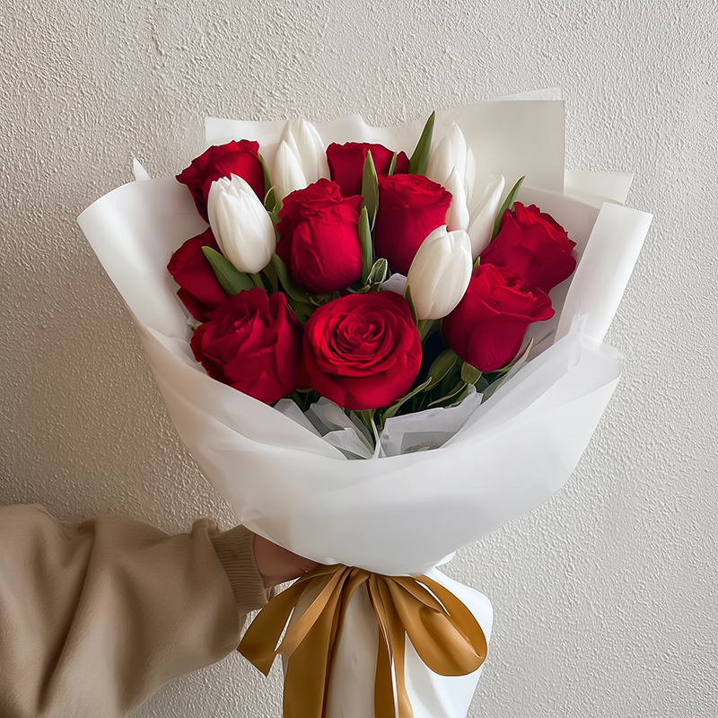 This bouquet, featuring vibrant red roses and pure white tulips as its main highlights, offers a unique and captivating visual experience. The red roses, like burning flames, convey deep love and passion, while the white tulips, like the first sunlight after snow, symbolise purity and hope. These two colours are beautifully intertwined in the bouquet, creating a look that is both passionate and refreshing.